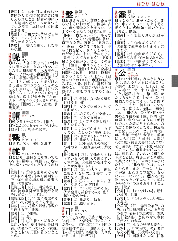 なら「る・し・し」を簡略化した見出し「はむむ」で引くだけです。構成要素の読みなどの頭文字をつなげて見出しとするだけ。だけど読めない・知らない構成要素があったら「ん」で見出しをつけます(トランプのジョーカーだと思ってください)。最初とまどいますが、電話で漢字を伝える場合をイメージしながら見出しをつけていけばすぐ慣れます。