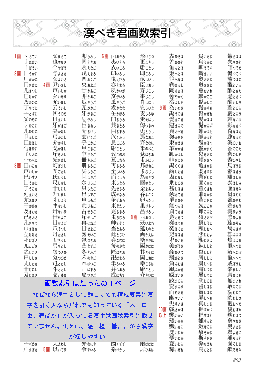 現代漢字辞典は漢ぺき君索引以外に従来の音訓引きや一部漢字は画数引きもあるので漢ぺき君を知らない人でも使えます。